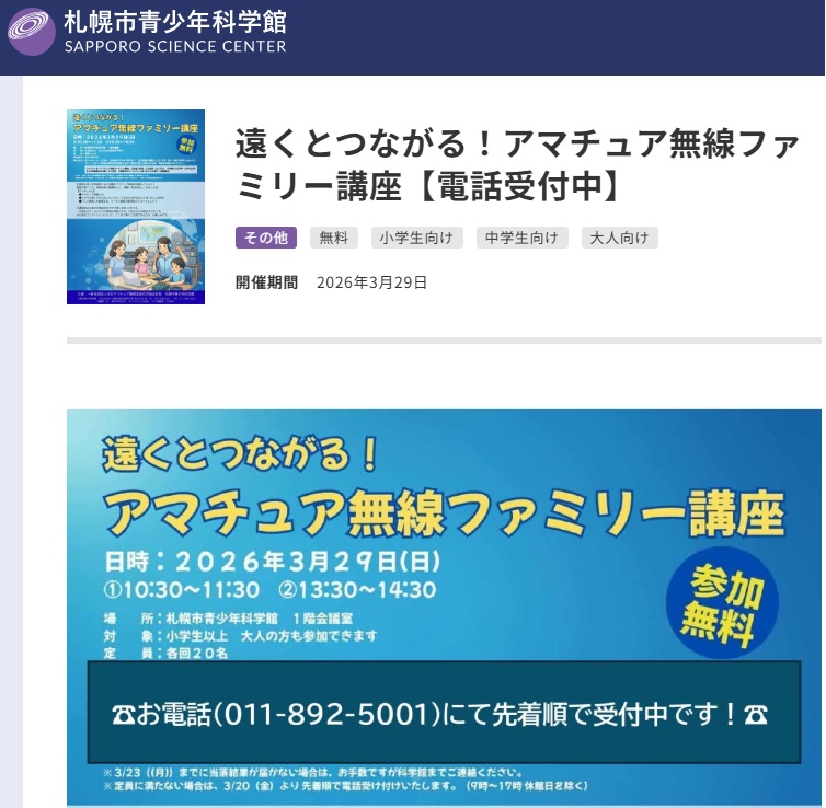 JARL石狩後志支部では、2026年3月29日(日)に、札幌市青少年科学館にて、「遠くとつながる!アマチュア無線ファミリー講座」を行います。午前の部、午後の部、内容は同じで、各20名を募集いたします。ご希望の方は、札幌市青少年科学館のウェブサイトから申し込みをお願いいたします。なお、講座の性格上、まだアマチュア無線の資格を持っていない学生さんと、その保護者に、無線の紹介と体験をしてもらうことが中心となります。既に開局済みで交信実績多数の方には、少し物足りない内容になりますのでご容赦ください。ハムに触れたことのない、お知り合い、ご家族にぜひ紹介いただければと思います。(青少年科学館ウェブサイトは下記)